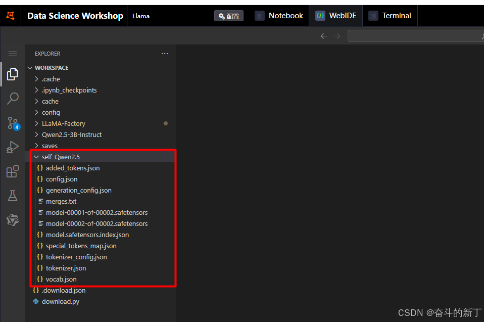 首先我们准备好这种格式的json文件,这个文件起名叫self_cognition.json。将其放在安装的LLaMA-Factory下的data下,并且在dataset_info.json中配置上该文件